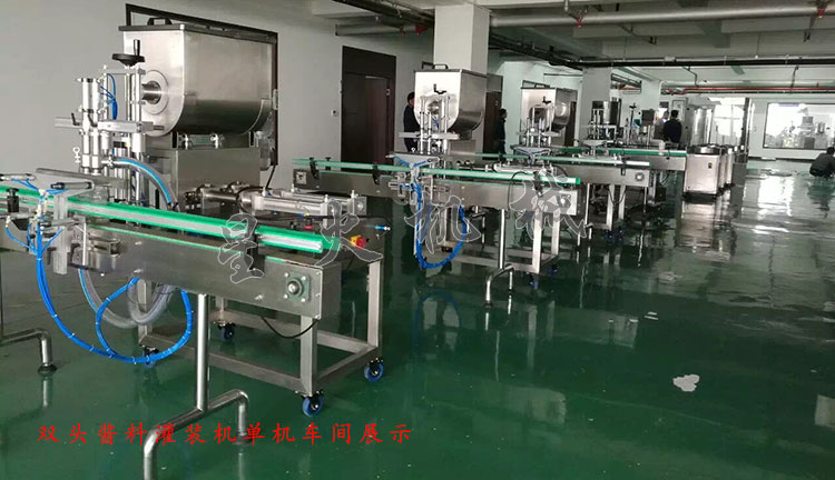 全自動醬料灌裝生產線,雙頭辣椒醬灌裝生產線除了雙頭醬料灌裝機以外,還有真空旋蓋機,噴碼機,貼標機,自動封箱捆扎生產線等重要的設備。